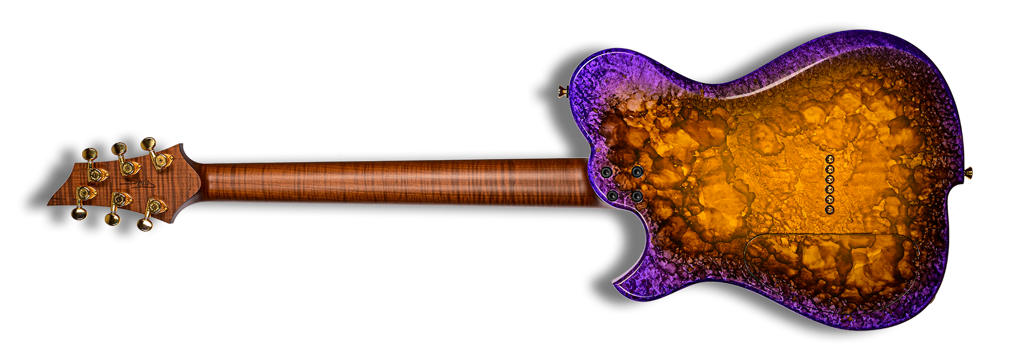 La version violette possède un manche en érable ondé torréfié et les versions Rose/noire un manche en érable ondé blanc ainsi qu'un corps en aulne.